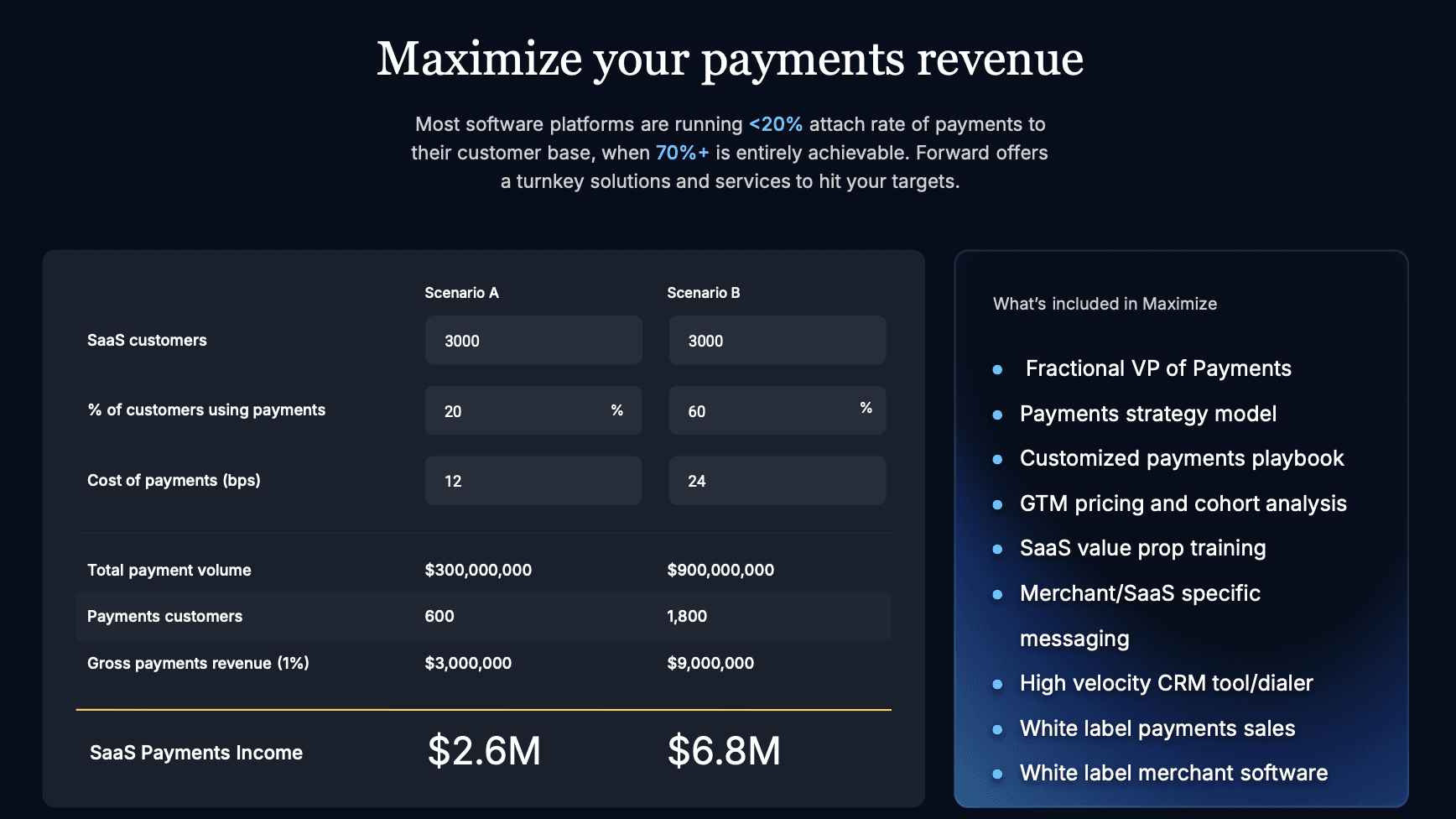 Growing a payments business requires more than a product—it takes focused execution. It’s not something you can layer onto a sales or support team’s existing workload. Maximize gives you a proven, high-conviction blueprint—and the dedicated resources to run it—used successfully by platforms ranging from $2M ARR startups to public companies.